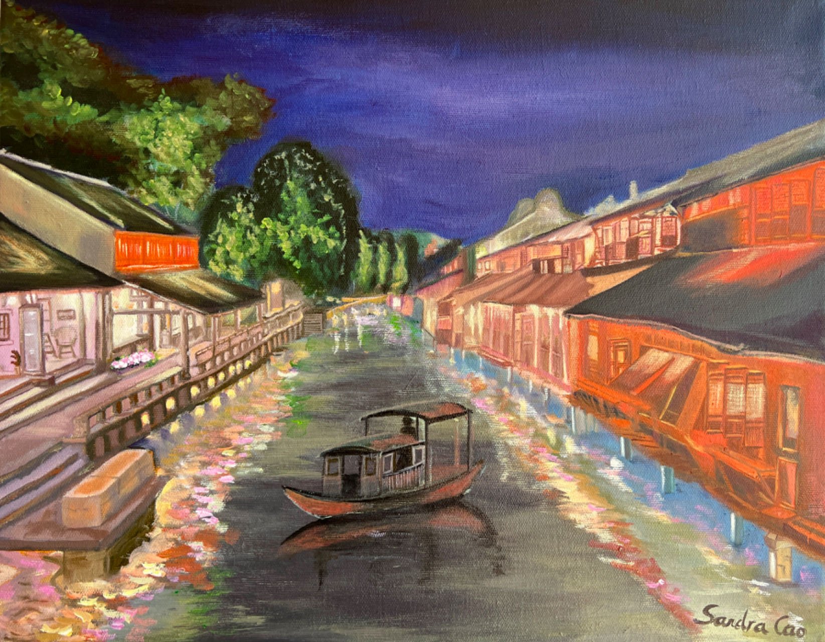 The night view of Wuzhen, Acrylic, 16″ x 20″, 2022, SOLD